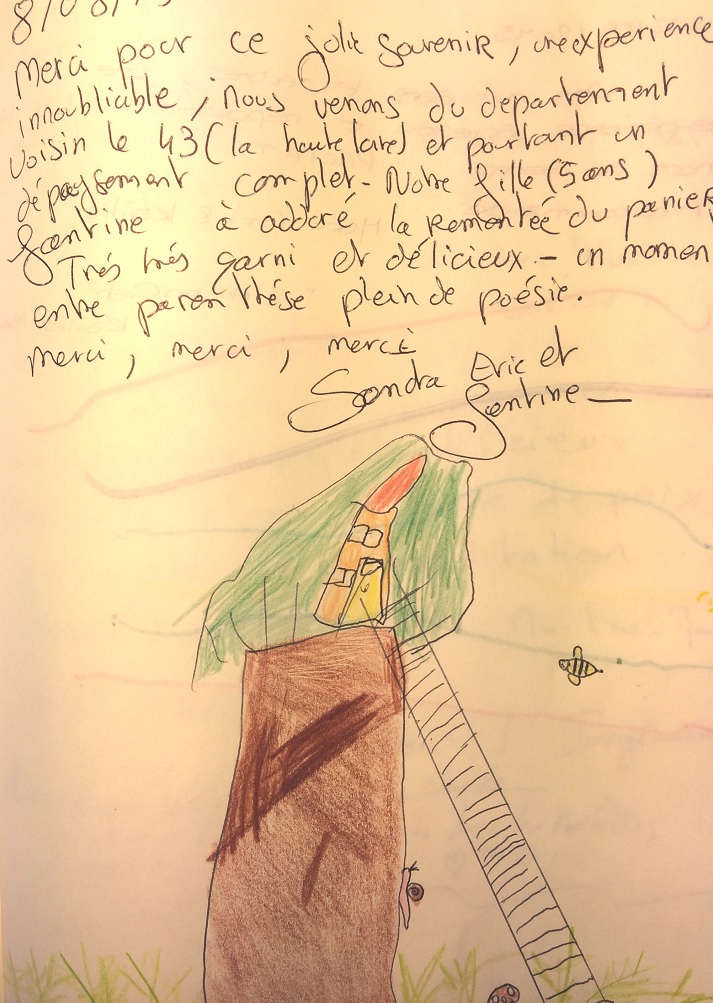 Merci pour ce joli souvenir, une expérience inoubliable; nous venons du département voisin le 43 (la Haute Loire) et pourtant un dépaysement complet. Notre fille (5 ans), Fantine a adoré la remontée du panier. Très très garni et délicieux. Un moment entre parenthèse plein de poésie. Merci, merci, merci. Sandra, Eric et Fantine